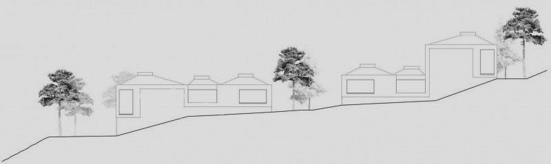 The four houses are built up in a modular way, identical in the basic conception but mirrored in the common middle and reacting individually to the particular topographic situation. The stringent structure of the layout is reflected in the facades as well as the roof-landscape. Each room has it’s own baldachin with a skylight at the upmost position. The roofs react on the scale and importance of the particular rooms and help to arrange the different functions.